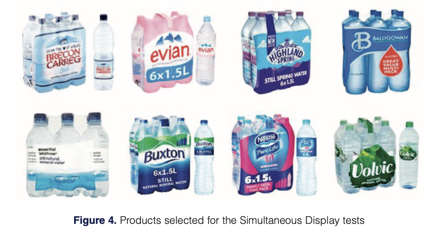 en la presentación simultánea, se presentaron ocho botellas de agua dispuestas en una retícula.