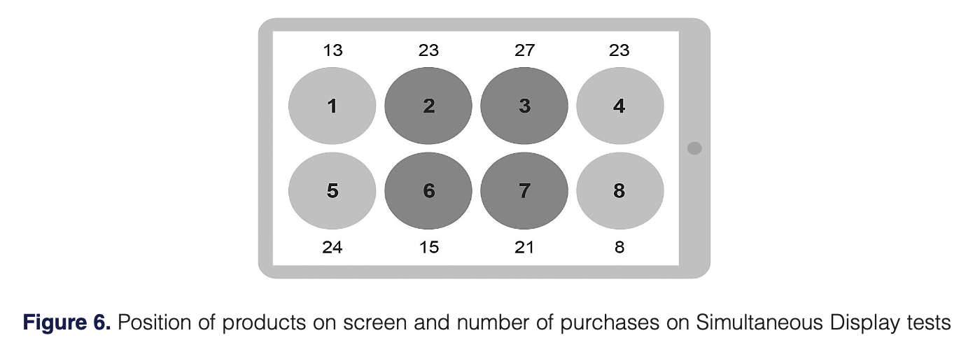 con respecto a las compras onLine, especialmente a través de dispositivos móviles con pantallas pequeñas (teléfonos celulares principalmente), se sabe de modo empírico (con algunas pocas fuentes en la literatura), que el diseño mismo, layout, color, posición, etc. de cómo los productos estén “presentados” influye en menor o mayor modo la decisión de compra.