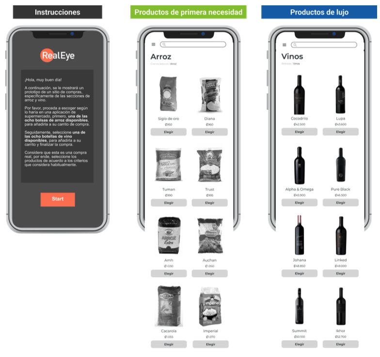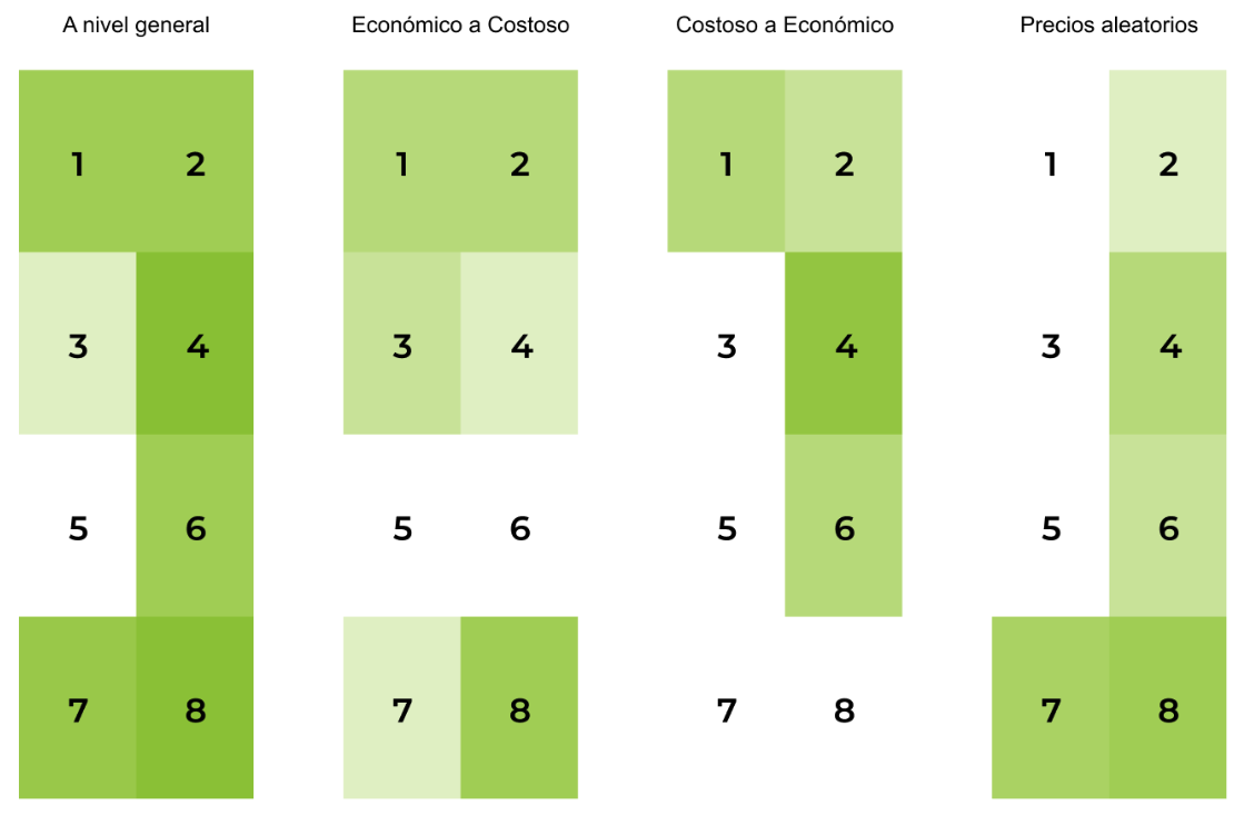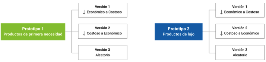 se utilizaron prototipos con productos de arroz (primera necesidad) y vino (producto de lujo), con tres versiones de distribución (precio ascendente, descendente y aleatoria).